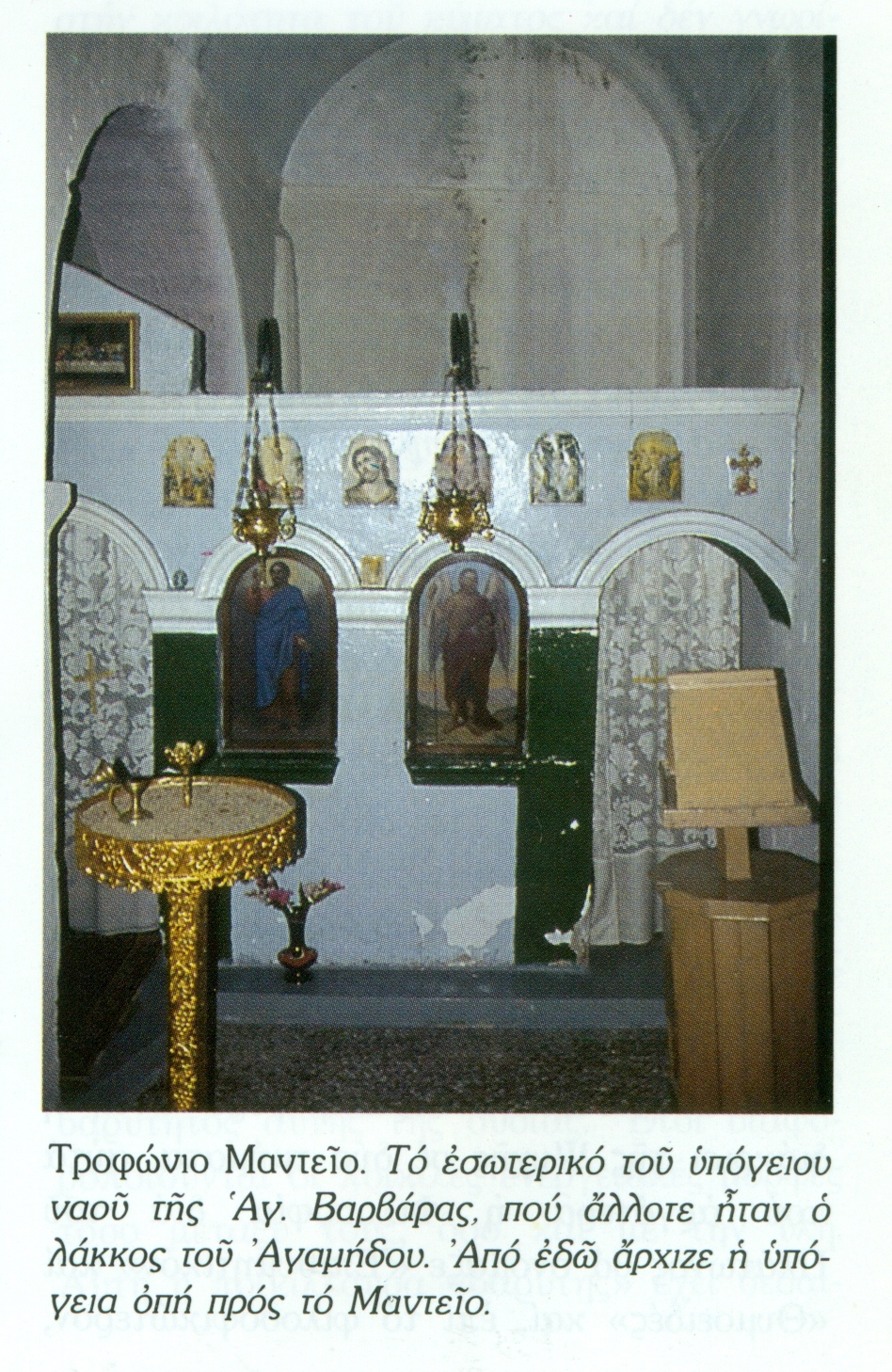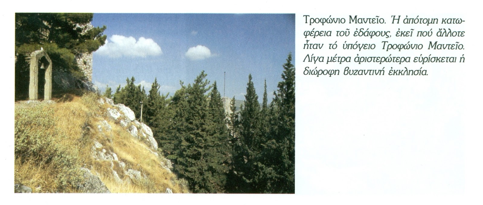 Μεταξὺ τῶν χρηστηριασθέντων σὲ αὐτὸ τὸ Μαντεῖο ἦταν καὶ ὁ Παυσανίας, ὁ ὁποῖος τὸ περιέγραψε στὸ βιβλίο του μὲ τέτοιο θαυμασμό, ὥστε ὑποστήριξε πὼς ὁ Τροφώνιος πρέπει νὰ ἦταν γιὸς τοῦ Ἀπόλλωνος -ἀλλὰ βέβαια ἀπέφυγε νὰ ἀναφέρει κι αὐτὸς κάτι γιὰ τὸ χρησμὸ ποὺ ἔλαβε. Μολονότι πράγματι, ἔμεναν ἀπόρρητοι οἱ χρησμοὶ τοῦ Τροφωνίου Μαντείου ἔχαιρε μεγάλου σεβασμοῦ καὶ γι αὐτὸ ὑπῆρξε καὶ μακροβιώτατο. Δὲν σταμάτησε νὰ λειτουργεῖ, παρὰ μόνον στὴν βυζαντινὴ ἐποχή, ὅταν τὸ κατέστρεψαν. Ἡ καταστροφὴ τοῦ Τροφωνίου Μαντείου ὑπῆρξε πράγματι ἐπιμελημένη. Ὁ ὑπαίθριος λάκκος -ἁλώνι, ποὺ κατέβαινε ὁ χρηστηριαζόμενος, πρὶν εἰσχωρήσει στὴν ὀπή τῆς γῆς, μετετράπη σὲ ὑπόγειο χριστιανικὸ ναό (τῆς Ἁγ. Βαρβάρας) καὶ ἐπάνω του ἀνηγέρθη καὶ δεύτερος ὑπέργειος ναός (τῆς Ἁγ. Σοφίας). Ἔτσι μὲ τὴν τοιχοποιία τοῦ ὑπόγειου ναοῦ ἀπεκρύβη ἡ ὀπὴ τῆς γῆς, ἐνῶ τὸ συνεχόμενο ὑπόγειο ἄντρο ἀνεσκάφη: Δίπλα στὸν διώροφο ναό, ἐκεῖ ποὺ ἄλλοτε ἦταν τὸ μαντικὸ σπήλαιο, βλέπει κανεὶς σήμερα μιὰ ἀπότομη κατωφέρεια τῆς γήινης ἐπιφάνειας.