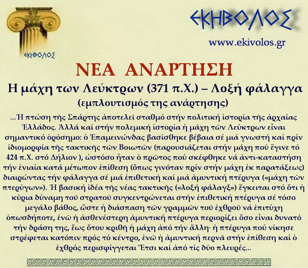 Η μάχη των Λεύκτρων (371 π.Χ.) – Λοξή φάλαγγα ολόκληρο το αρχείο-pdf Βαθμολογία:Κοινοποιήστε: Πατήστε για κοινοποίηση στο Facebook(Ανοίγει σε νέο παράθυρο) Facebook Κάνε κλικ για να μοιραστείς στο X(Ανοίγει σε νέο παράθυρο) Χ Κλικ για αποστολή ενός συνδέσμου μέσω email σε έναν/μία φίλο/η(Ανοίγει σε νέο παράθυρο) Email Κλικ για εκτύπωση(Ανοίγει σε νέο παράθυρο) Εκτύπωση Μου αρέσει! Φόρτωση... Σχετικά Δημοσιεύθηκε από ΕΚΗΒΟΛΟΣ Δείτε όλα τα άρθρα του/της ΕΚΗΒΟΛΟΣ