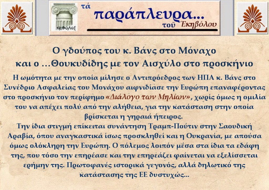 Ο γδούπος του κ. Βάνς στο Μόναχο και ο… Θουκυδίδης με τον Αισχύλο στο προσκήνιο ολόκληρο το αρχείο-pdf Βαθμολογία:Κοινοποιήστε: Πατήστε για κοινοποίηση στο Facebook(Ανοίγει σε νέο παράθυρο) Facebook Κάνε κλικ για να μοιραστείς στο X(Ανοίγει σε νέο παράθυρο) Χ Κλικ για αποστολή ενός συνδέσμου μέσω email σε έναν/μία φίλο/η(Ανοίγει σε νέο παράθυρο) Email Κλικ για εκτύπωση(Ανοίγει σε νέο παράθυρο) Εκτύπωση Μου αρέσει! Φόρτωση... Σχετικά Δημοσιεύθηκε από ΕΚΗΒΟΛΟΣ Δείτε όλα τα άρθρα του/της ΕΚΗΒΟΛΟΣ